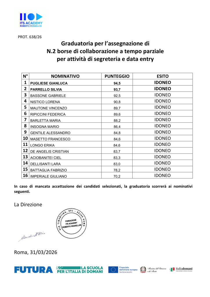 Si comunica che è stata approvata la graduatoria definitiva relativa al Bando Prot.220/26 per l’assegnazione di n. 2 borse di collaborazione, destinate agli studenti iscritti alla prima annualità del Biennio 2025–2027.